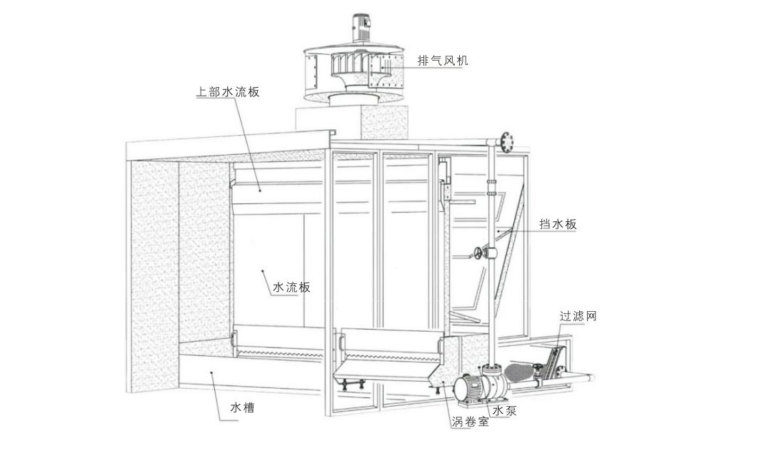 環(huán)保型水幕柜主要是由自吸水泵循環(huán)抽水往水簾板上均勻的流下來,使噴槍噴出來的漆霧和打磨產(chǎn)生的大顆粒粉塵被水簾板上的水打到下面水池里。再有少部分細微的漆霧和粉塵顆粒被末端的風機引入高效過濾器,通過排風管道排出車間外面或進行高空排放。